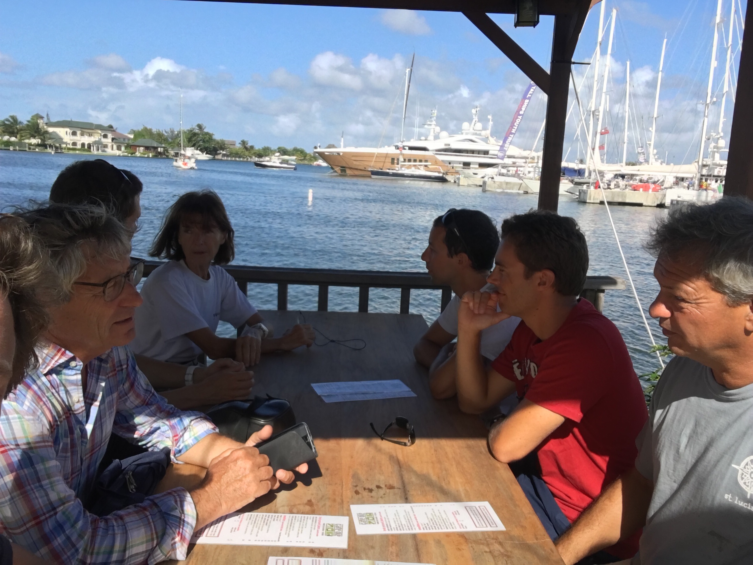 7h heure locale, Hina déboule autour de la pointe nord de l’ile, surfant à plus de 8 noeuds sur ses dernières vagues transatlantiques. Pigeon Island – derrière laquelle se trouve la ligne d’arrivée, est en vue. Nous contactons la ligne d’arrivée sur la VHF: