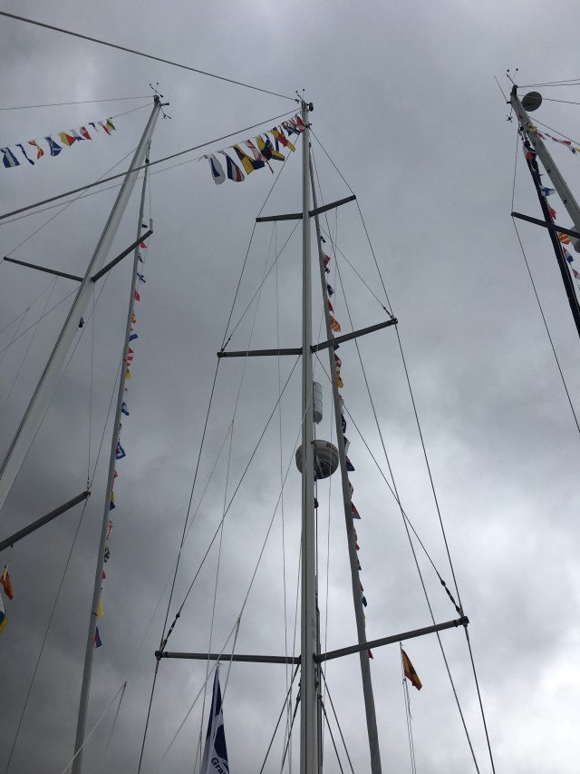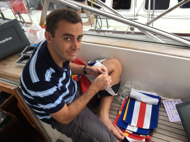 Yan en train d’attacher ensemble tous les drapeaux du « Grand Pavois », ornement de parade de la marine. L’ARC demande à tous ses concurrents de l’arborer avant la course. Le résultat est effectivement très festif