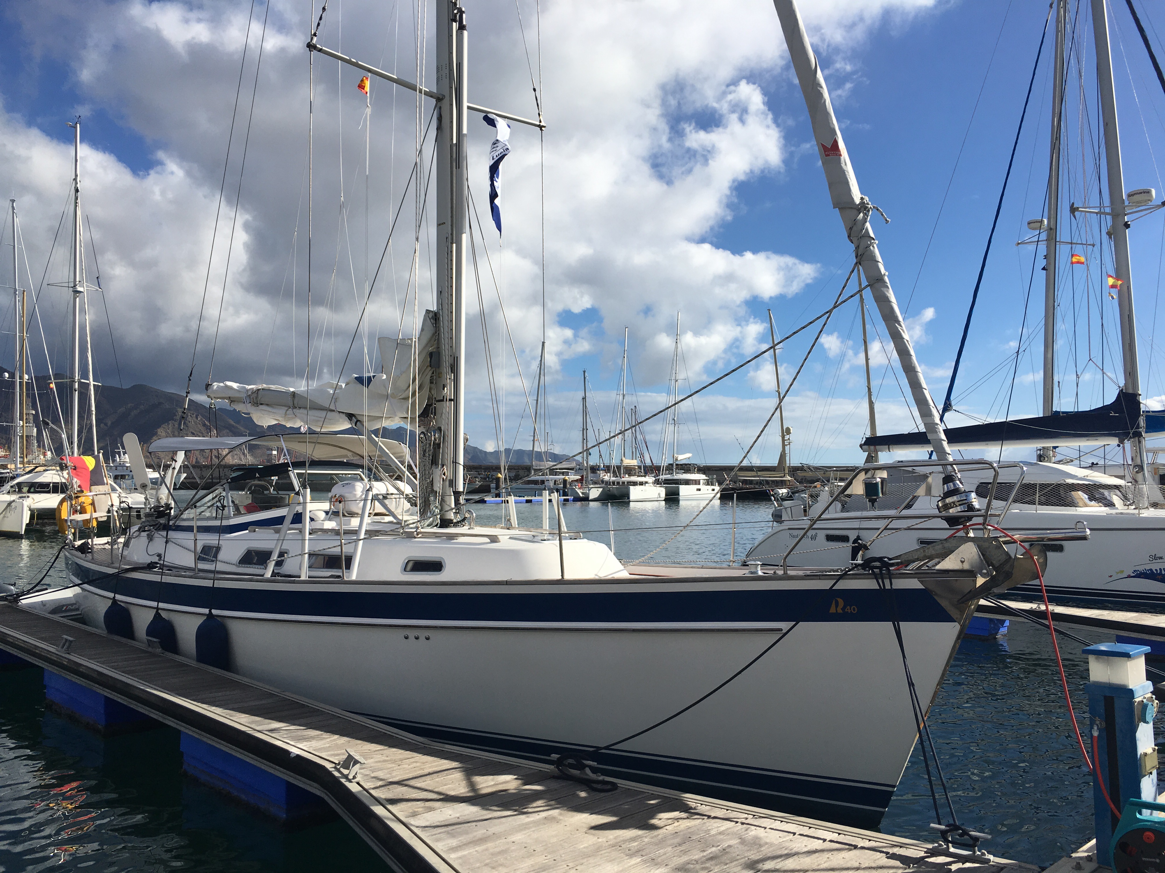 Greg et moi avons également tenté d’y voir plus clair sur le fonctionnement du Gennaker, voile d’avant pour le petit temps. Après analyse, il semblerait qu’il nous manque une partie du dispositif nécessaire à l’enroulement de la voile… Nombreux allers-retours avec le voilier (=fabricant de voiles). Celui-ci nous indique finalement qu’il est assez débordé, et qu’il ne pourra pas s’occuper de nous avant lundi – en cause, le départ imminent de l’ARC+. PAS de stress, on est pas (encore) pressés 😊