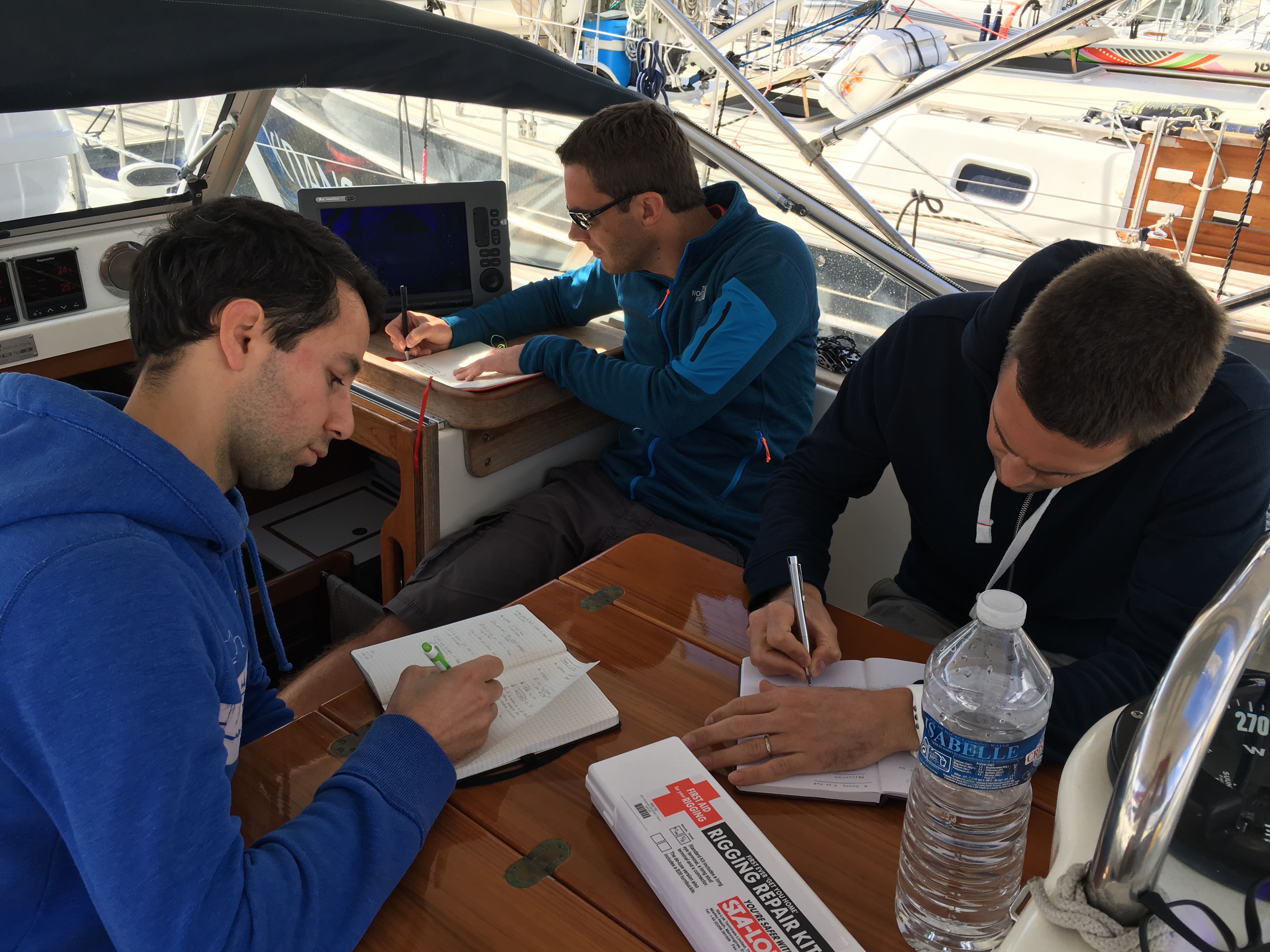 09AM ce jeudi matin: premier briefing sécurité avec l’équipage au complet. Au programme de la journée: exercices sur papier autour des 6 grandes urgences en mer (homme à la mer, feu à bord, voie d’eau, urgence médicale, démâtage et perte du système de barre).